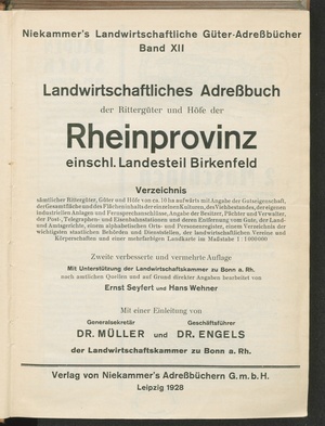 Landwirtschaftliches Adreßbuch der Rittergüter und Höfe der Rheinprovinz einschl. Landesteil Birkenfeld : Verzeichnis sämtlicher Rittergüter, Güter und Höfe von ca. 10 ha aufwärts mit Angabe der Gutseigenschaft, der Gesamtfläche und des Flächeninhalts der einzelnen Kulturen, des Viehbestandes, der eigenen industriellen Anlagen und Fernsprechanschlüsse, Angabe der Besitzer, Pächter und Verwalter, der Post-, Telegraphen- und Eisenbahnstationen und deren Entfernung vom Gute, der Land- und Amtsgerichte, einem alphabetischen Orts- und Personenregister, einem Verzeichnis der wichtigsten staatlichen Behörden und Dienststellen, der landwirtschaftlichen Vereine und Körperschaften und einer mehrfarbigen Landkarte im Maßstabe 1 : 1000000 / mit Unterstützung der landwirtschaftskammer zu Bonn a. Rh. nach amtlichen Quellen und auf Grund direkter Angaben bearb. von Ernst Seyfert und Hans Wehner ; mit einer Einleitung von Müller und Engels