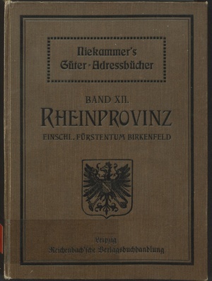 Landwirtschaftliches Adreßbuch der Güter und größeren Hofe der Rheinprovinz, einschl. Fürstentum Birkenfeld : Verzeichnis sämtlicher Güter und größeren Höfe der Provinz mit Angabe des Grundsteuer-Reinertrages, der Gesamtfläche und des Flächeninhalts, der einzelnen Kulturen, des Viehbestandes, aller industriellen Anlagen und der Fernsprechanschlüsse, Angabe der Besitzer, Pächter und Verwalter, der Post-, Telegraphen- und Eisenbahnstationen und deren Entfernung vom Hofe, der katholischen und evangelischen Kirchspiele, der Standesamtsbezirke, der Bürgermeistereien, der Amtsgerichte, einem alphabetischen Orts- und Personenregister, dem Handbuch der Provinzialbehörden, sowie einer Karte der Provinz im Maßstabe 1:750000 / mit Unterstützung der Landwirtschaftskammer zu Bonn a. Rh. nach amtlichen Quellen und auf Grund direkter Angaben bearb. von Ernst Seyfert