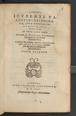 Lavrentii Iovberti Valentini Delphinatis, Apvd Monspelienses Medicae Artis Professoris, De Peste Liber Vnvs : Ad clariss. D. Henricvm Stapedivm Agrippinatem, Medicum sapientissimum