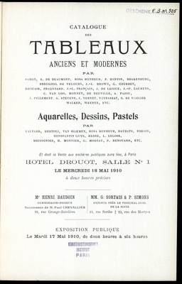 Catalogue des tableaux anciens et modernes : par Baron, E. de Beaumont, Rosa Bonheur, F. Bonvin, Brakenburg [und weiteren] : aquarelles, dessins, pastels : par Baltard, Bertoli, van Blœmen, Rosa Bonheur, Dauzats [und weiteren] : dont la vente aux enchères publiques aura lieu, à Paris Hôtel Drouot, Salle No 1, le mercredi 18 mai 1910 / Henri Baudoin, commissaire-priseur, successeur de Paul Chevallier ; G. Sortais & P. Simons, experts près le Tribunual civil de la Seine