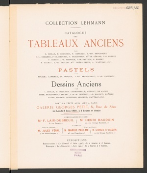 Catalogue des tableaux anciens par L. Boilly, F. Boucher, P. Danloux, L. Ph. Debucourt, J.L. Demarne, F.H. Drouais, H. Fragonard, Mlle M. Gérard, J.B. Greuze, F. Guardi, J.E. Heinsius, J.M. Nattier, H. Robert, N. Taunay, L.M. Vanloo, Mme Vigée Lebrun, A. Watteau, etc.; pastels par Rosalba Carriera, H. Drouais, J.B. Perronneau, P.P. Prud'hon : dessins anciens par L. Boilly, F. Boucher, Carmontelle, Cosway, De Machy, Eisen, Fragonard, Lancret, J.A.M. Lemoine, J.B. Mallet, Natoire, Pater, Portail, Queverdo, Sergent, Watteau, etc : collection Lehmann ; dont la vente aura lieu à Paris, Galerie Georges Petit, le lundi 8 juin 1925 ; [deuxième partie] / commissaires-priseurs F. Lair-Dubreuil