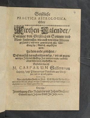 Geistliche Practica Astrologica : oder Kirchen-Kalender, darinne von Geistlichen Sonnen und Mond-Finsternissen wie auch von bösen Aspecten gehandelt und was gemeiniglich ihre Wirckung sey, kürtzlich angeführet wird ; zu dem Ende gerichtet, daß man sich darauß ersehen möge, wie es gegenwertiges Jahr und künfftige Zeit wittern werde ... / gestellet durch M. Casparum Stillern von Leiptzig, jetzt Pfarrern zur Newstadt am Weißfurt, und in Druck gegeben ...