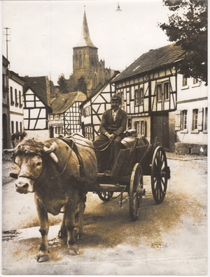 Ochsengezogener Leiterwagen mit Jauchefass auf der Ladefläche aus dem Orts fahrend