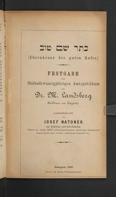 Keter shem ṭov : Festgabe zum fünfundzwanzigjährigen Amtsjubiläum des Dr. M. Landsberg, Rabbiner zu Liegnitz / dargereicht von Josef Natonek (em. Rabbiner und Schriftsteller, Verfasser des "Schlosche kmozim", "Wissenschaft-Religion", "Historisches Charakterbild ausgezeichneter israel. Frauen", "Erhabenstes Frauenlob" etc.)