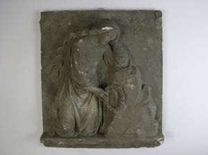 Trauernde Frau mit Kranz