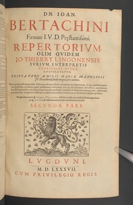 Io. Bertachini Firmani, Repertorij Pars ... Repertorivm Clarissimi viri ... Io. Bertachini Firmani: in quo, quicquid notatu, cognitúque dignum, in ... lecturis habetur, miro artificio, seriéque Alphabetica congestum, reperias. Cui, pre̜ter alias ... Additiones, ingens accessit ... Corollarioru[m], Additionumq́[ue] ... Thesaurus ..