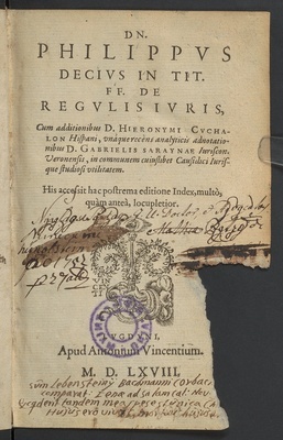 Dn. Philippvs Decivs In Tit. Ff. De Regvlis Ivris : Cum additionibus Hieronymi Cvchalon Hispani unáque recèns analyticis adnotationibus Gabrielis Saraynae ... ; his accessit hac postrema Editione Index, multò, quàm anteà, locupletior