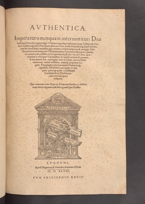 Avthentica : Imperatoris nunquam intermorituri Diui Iustiniani Nouellae (quas vulgò Volumen appellari collubuit) totius Mehercule Censurae Ciuilis, atq[ue] adeò Principum ipsorum velut Aresta Praeiudiáq[ue] semel definita ...
