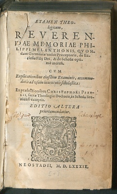 EXAMEN THEO-||logicum,|| REVEREN-||DAE MEMORIAE PHI-||LIPPI MELANTHONIS, QVON-||dam Germaniae totius Praeceptoris, de Ec-||clesia Filij Dei, & de Scholis opti-||mè mereri.|| CVM || Explicationibus eiusdem Examinis, accommo-||datis ad vsum iuuentutis scholasticae:|| Ex praelectionibus CHRISTOPHORI PEZE-||LII, sacrae Theologiae Doctoris, in Schola Bre-||mensi exceptis.|| EDITIO ALTERA || priori emendatior.||