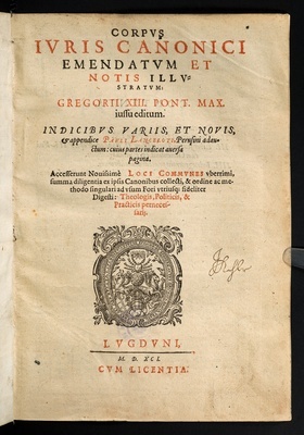 Corpvs Ivris Canonici Emendatvm Et Notis Illvstratvm : Accesserunt Nouissimè Loci Commvnes vberrimi, summa diligentia ex ipsis Canonibus collecti, & ordine ac methodo singulari ad vsum Fori vtriusq[ue] fideliter Digesti: Theologis, Politicis, & Practicis perneccessarij / Gregorii XIII. Pont. Max. iussu editum. Indicibvs Variis, Et Novis, & appendice Pavli Lanceloti, Perusini adauctum ...