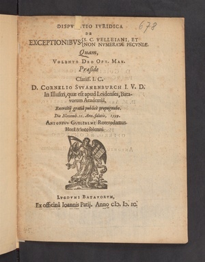Dispvtatio Ivridica De Exceptionibvs S. C. Velleiani, Et Non Nvmerate Pecvniæ / Quam, ... Præside ... D. Cornelio Swanenburch ... Exercitij gratia publice propugnabo. Die Novemb. 10. Ann. salutis, 1599. Antonius Guilielmi Roterodamus. Hora & loco solemni.