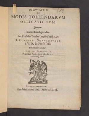Dispvtatio De Modis Tollendarvm Obligationvm. / Quam ... Sub Præsidio Clarißimi ... D. Cornelii Swanenbvrgii ... Publice tueri conabor Henricvs Provningivs Pridie Cal. April. Anno M.D.IC. Horis Locque solitis