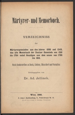 Märtyrer- und Memorbuch : Verzeichniss der Märtyrergemeinden aus den Jahren 1096 und 1349, das alte Memorbuch der Deutzer Gemeinde von 1581 bis 1784 nebst Auszügen aus dem neuen von 1786 bis 1816 : nach Handschriften zu Deutz, Coblenz, Düsseldorf und Versailles / herausgegeben von Dr. Ad. Jelinek