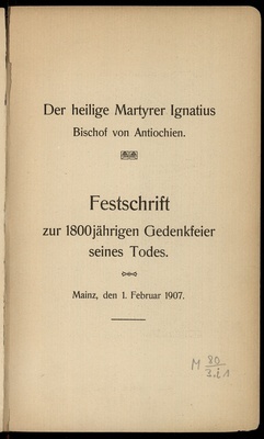Der heilige Martyrer Ignatius, Bischof von Antiochien : Festschrift zur 1800jährigen Gedenkfeier seines Todes ; Mainz, den 1. Februar 1907