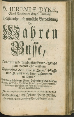 Geistreiche und nützliche Betrachtung Der Wahren Busse : Als Des ersten und fürnehmsten Grund-Wercks zum wahren Christenthum ; nunmehro dem innern Kern, Safft und Krafft nach kurtz zusammen gezogen / Ieremia Dyke