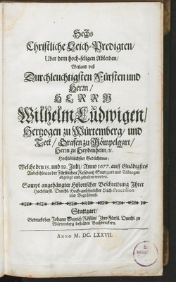 Sechs Christliche Leich-Predigten/ Uber dem hoch-seligen Ableiben/ Weiland deß Durchleuchtigsten Fürsten und Herrn/ Herrn Wilhelm Ludwigen/ Hertzogen zu Würtemberg/ und Teck ... Hochlöblichster Gedächtnus : Welche den 15. und 19. Julij/ Anno 1677. ... in der Fürstlichen Residentz Stuttgart und Tübingen abgelegt und gehalten worden ; Sampt angehängter Historischer Beschreibung Jhrer Hochfürstl. Durchl. Hoch-ansehnlicher Leich-Procession und Begräbnuß