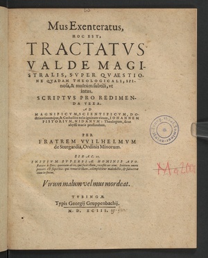 Mus Exenteratus, Hoc Est, Tractatvs Valde Magistralis, Svper Qvaestione Qvadam Theologicali, Spinosa, & multum subtili, vt intus. Scriptvs Pro Redimenda Vexa ... / Per Fratrem Vvilhelmvm de Stutgardia, Ordinis Minorum [d.i. Wilhelm Holder]