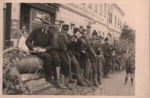Junggesellen mit dem Maibaum vor dem Lebensmittelgeschäft Jupp Schuld auf dem Weg zum Aufstellplatz