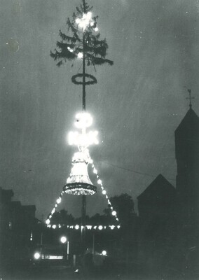 Kirmesbaum und Eierkrone mit Beleuchtung, Kirchplatz Bendorf, 1955