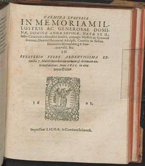 Carmina Lvgvbria : in Memoriam Illustris Ac Generosae Dominae, Dominae Annae-Sophiae, Natae Ex ILlustri Comitum à Mansfeld famìliâ, conjugis Illustris ac Generosi Domini, Domini Hermanni Adolphi, Comitis in Solms, Domini in Mintzeberg & Sonnenwald, &c. In Pverperio Febre Ardentissima Extinctae 7. Martii ... Anni 1601. in arce hohen Solms.