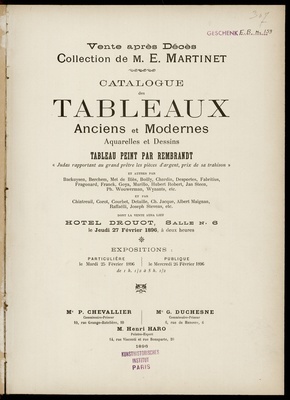Catalogue des tableaux anciens et modernes, aquarelles et dessins, tableau peint par Rembrandt ... et d'autres par Bachuysen, Berchem, Met de Blès, Boilly, Chardin, Desportes, Franck, Goya, Murillo, Hubert Robert, Jan Steen, Ph. Wouwerman, Wynants, etc., et par Chintreuil, Corot, Courbet, Detaille, Ch. Jacque, Albert Maignan, Raffaëlli, Joseph Stevens, etc., vente après décès : collection de M. E. Martinet ; dont la vente aura lieu à Paris, Hôtel Drouot, salle 6, le jeudi 27 février 1896 / commissaires-priseurs P. Chevallier et G. Duchesne