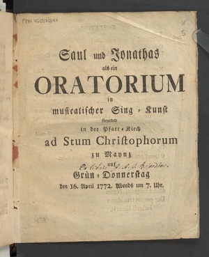 Saul und Jonathas als ein Oratorium in musicalischer Sing-Kunst fürgestellt in der Pfarr-Kirch ad Stum Christophorum zu Maynz auf Grün-Donnerstag den 16. April 1772. Abends um 7. Uhr