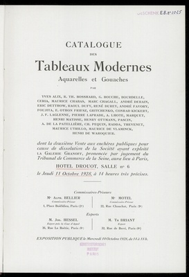 Catalogue des tableaux modernes : aquarelles et gouaches : par Yves Alix, R.Th. Bosshard, G. Bouche, Bourdelle [und weitere] : dont la deuxième vente aux enchères publiques .... aura lieu à Paris, Hôtel Drouot, Salle No 6, le jeudi 11 octobre 1928 / commissaires-priseurs Alph. Bellier, Motel ; experts Jos. Hessel, Th. Briant