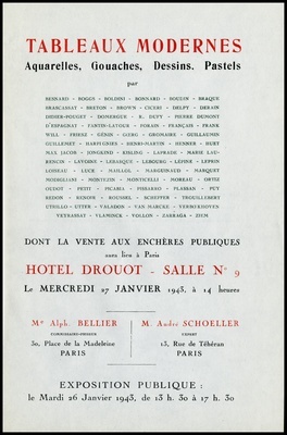 Tableaux modernes : aquarelles, gouaches, dessins, pastels : par: Besnard, Boggs, Boldini, Bonnard, Boudin, Bracque [und weitere] : dont la vente aux enchères publiques aura lieu à Paris, Hôtel Drouot, Salle No 9, le mercredi 27 janvier 1943 / Me Alph. Bellier, commissaire-priseur ; André Schœller, expert