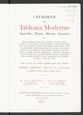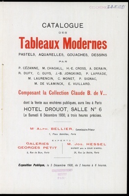 Catalogue des tableaux modernes : pastels, aquarelles, gouaches, dessins : par P. Cézanne, M. Chagall, H.-E. Cross, A. Derain [und weiteren] : composant la Collection Claude B. de V... : dont la vente aux enchères publiques, aura lieu à Paris, Hôtel Drouot, Salle No 6, le samedi 6 décembre 1930 / Alph. Bellier, commissaire-priseur ; experts Galeries Georges Petit, Jos. Hessel, expert près la Cour d'Appel