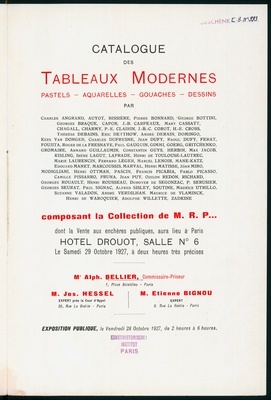 Catalogue des tableaux modernes, pastels, aquarelles, gouaches, dessins par Charles Angrand, Auyot, Bissière ..., composant la collection de M. R. P... [i.e.R. Pellequer], dont la vente ... aura lieu à Paris, Hotel Drouot, le samedi 29 octobre 1927 / Alph. Bellier, commissaire-priseur ...