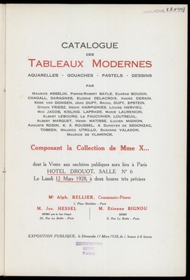 Catalogue des tableaux modernes : aquarelles, gouaches, pastels, dessins : par Maurice Asselin, Pierre-Robert Bayle, Eugène Boudin [und weiteren] : composant la Collection de Mme X... : dont la vente aux enchères publiques aura lieu à Paris, Hôtel Drouot, Salle No 6, le lundi 12 mars 1928 / Alph. Bellier, commissaire-priseur ; Jos. Hessel, expert près la Cour d'Appel, Etienne Bignou, expert
