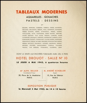 Tableaux modernes : aquarelles, gouaches, pastels, dessins : par: Boldini, Bonnard, Carrière, Chirico, Cross, Daubigny [und weitere] : dont la vente aux enchères publiques aura lieu à Paris, Hôtel Drouot, Salle No 10, le jeudi 6 mai 1943 / Me Alph. Bellier, commissaire-priseur ; André Schœller, expert