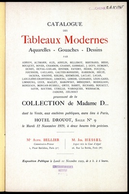 Catalogue des tableaux modernes : aquarelles, gouaches, dessins : par Adrion, Altmann, Alix, Asselin, Bellenot, Bertrand, Besse [und weitere] : provenant de la Collection de Madame D... : dont la vente, aux enchères publiques aura lieu à Paris, Hôtel Drouot, Salle No 9, le mardi 12 novembre 1929 / Alph. Bellier, commissaire-priseur ; Jos. Hessel, expert près la Cour d'Appel