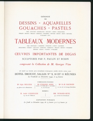 Catalogue des dessins, aquarelles, gouaches, pastels par Auguste, Bonington, Boudin ..., tableaux modernes par Bonnard, Carrière, Cézanne ..., œuvres importantes de Degas, sculptures par P. Paulin et Rodin, composant le collection de M. Georges Viau et dont la vente ... après décès aura lieu Hotel Drouot, le vendredi 11 décembre 1942 / commissaires-priseurs Alph. Bellier ...