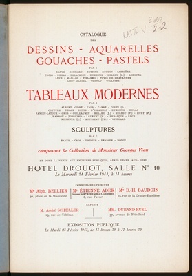 Catalogue des dessins, aquarelles, gouaches, pastels par Barye, Bonnard, Bottini ..., tableaux modernes par Albert André, Cals, Carré ..., sculptures par Barye, Cros, Drivier ..., composant la collection de monsieur Georges Viau et dont la [deuxième] vente ..., après décès, aura lieu Hotel Drouot, le mercredi 24 février 1943 / commissaires-priseurs Alph. Bellier ...