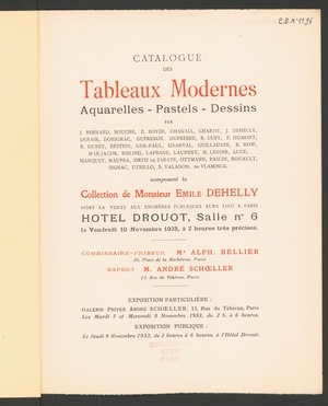 Catalogue des tableaux modernes, aquarelles, pastels, dessins par J. Bernard, Bouche, E. Boyer ... : composant la collection de monsieur Emile Dehelly, dont la vente ... aura lieu à Paris Hotel Drouot le vendredi 10 novembre 1933 / commissaire-priseur Alph. Bellier ...