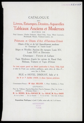 Catalogue des livres, estampes, dessins, aquarelles, tableaux anciens et modernes : œuvres de Paul Cézanne, Charles Dufresne, Raoul Dufy, Goya, Marie Laurencin, Rembrandt, Renoir, Toulouse-Lautrec etc. : peintures et objets d'art d'Extrême-Orient : objets d'art et de bel ameublement moderne de "Dominique" et "André Groult" : sièges et meubles anciens des époques Louis XV, Louis XVI et directoire : céramiques, verrerie de Lalique : tapis modernes d'après les cartons de Raoul Dufy, Rideaux, tentures et tapis d'Orient : le tout ayant garni un hôtel particulier à Paris, Villa Saïd : et dont la vente aux enchères publiques après décès de Miss P.... aura lieu à Paris, Hôtel Drouot, Salle No 6, les 6 et 7 juillet 1928 / commissaire-priseur: Alph. Bellier ; experts pour les tableaux modernes Jos. Hessel, pour les objets d'art d'Extrême-Orient And. Portier, pour les estampes Jean Cailac, pour les livres Ronald Davis