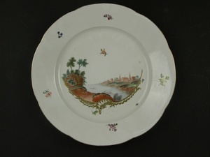 Teller mit Flußlandschaft über Goldrocaille