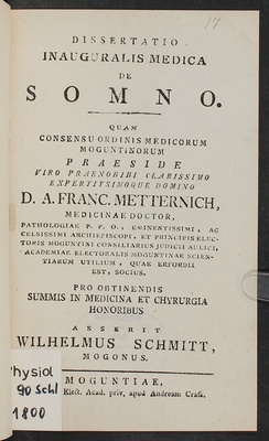 Dissertatio Inauguralis Medica De Somno / Quam Consensu Ordinis Medicorum Moguntinorum Praeside ... D. A. Franc. Metternich, Medicinae Doctor, .... Asserit Wilhelmus Schmitt, Mogonus.