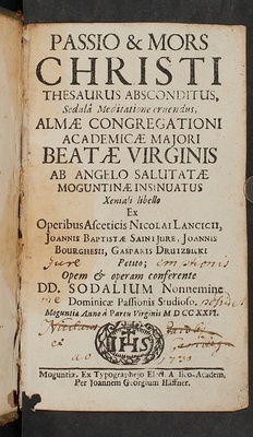 Passio & Mors Christi : Thesaurus Absconditus, Sedulâ Meditatione eruendus : Almae Congregationi Academicae Majori Beatae Virginis Ab Angelo Salutatae Moguntinae Insinuatus Xeniali libello / Ex Operibus Asceticis Nicolai Lancicii, Joannis Baptistæ Saint Jure, Joannis Bourghesii, Gasparis Drutzbicki Petito ...