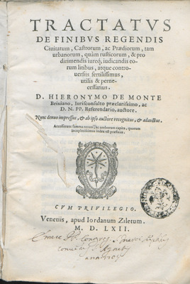 Tractatvs De Finibvs Regvndis Civitatvm, Castrorvm, Ac Praediorvm, Tam Vrbanorvm, Qvam Rvsticorvm : Et pro redimendis, iureque iudicandis eorum litibus, atque controuersis, fertilissimus, vtilis & pernecessarius / D. Hieromy. De Monte, I.C. Praeclarissimi. Nunc denuò editus, & ab ipso auctore recognitus & auctus