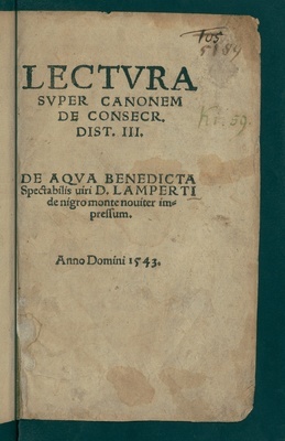Lectvra svper Canonem de consecr. dist. III. / de aqva benedicta spectab. viri D. Lamperti de nigro monte notiver impr.