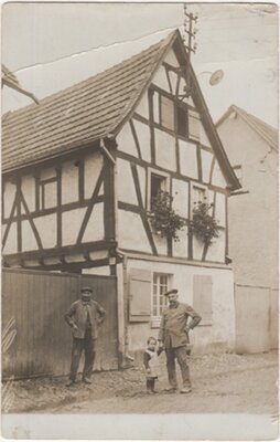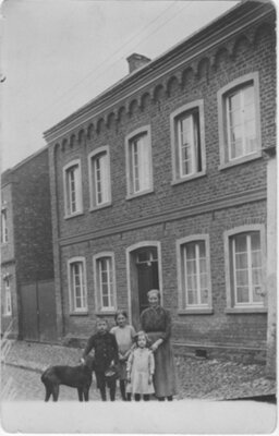 Mutter mit drei Kinder und Hund vor ihrem Wohnhaus