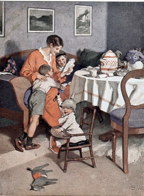 Mutter mit drei Kinder und Hund vor ihrem Wohnhaus