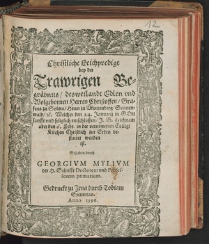 Christliche Leichpredigt || bey der || Trawrigen Be=||gräbnus/ des weilandt Edlen || vnd Wolgebornen Herren Christoffen/ Gra=||fens zu Solms/ Herrn zu Mintzenberg/ Sonnen=||wald/ [et]c. Welcher den 24. Januarij ... || entschlaffen/ J.G. Leichnam || aber den 6. Febr. in der vernewerten Collegi || Kirchen ... || be=||stattet worden || ist.|| Gehalten durch || GEORGIVM MYLIVM || der H. Schrifft Doctorem vnd Profes-||sorem primarium.||