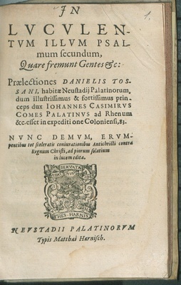 JN || LVCVLEN-||TVM ILLVM PSAL-||mum secundum,|| Quare fremunt Gentes &c:|| / Praelectiones DANIELIS TOS-||SANI, habitae Neustadij Palatinorum,|| dum ... || dux IOHANNES CASIMIRVS || COMES PALATINVS ad Rhenum || &c. esset in expeditione Coloniensi, 83.||