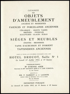 Catalogue des objets d'ameublement : anciens et modernes : faïences et porcelaines anciennes : céramique, objets variés, bronzes, pendules, sculptures, glaces, écran : sièges et meubles : étoffes, broderies : tapis d'Aubusson et d'Orient : tapisseries ancinennes : dont la vente aux enchères publiques aura lieu Hôtel Drouot, Salle No 1 le lundi 12 juillet 1943 / commissaire-priseur: Étienne Ader, successeur de Maurice Ader et F. Lair Dubreuil ; assisté de: P. Damidot et J. Lacoste, expert près le Tribunal civil de la Seine