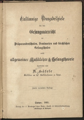 Einstimmige Übungsbeispiele für den Gesangunterricht an Präparandenschulen, Seminarien und kirchlichen Gesangschulen : nebst allg. Musiklehre & Gesangstheorie / bearb. von A. Haefele