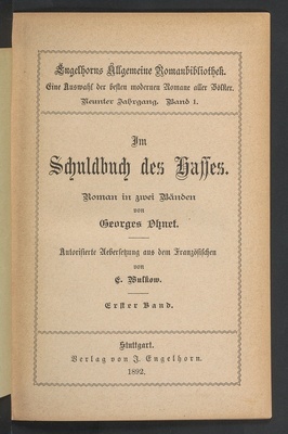 Im Schuldbuch des Hasses : Roman in zwei Bänden / von Georges Ohnet. Autoris. Übers. aus dem Franz. von E. Wulkow