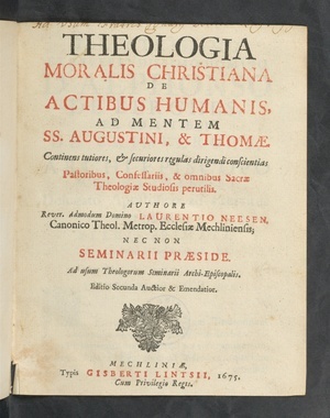 Theologia Moralis Christiana De Actibus Humanis, Ad Mentem Ss. Augustini, & Thomae : Continens tutiores, [et] securiores regulas dirigendi conscientias : Pastoribus, Confessariis, & omnibus Sacrae Theologiae Studiosis perutilis. Ad usum Theologorum Seminarii Archi-Episcopalis / Authore Rever. Admodum Domino Laurentio Neesen, Canonico Theol. Metrop. Ecclesiae Mechliniensis; Nec Non Seminarii Praeside.